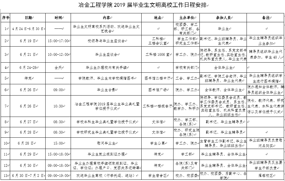 学生工作领导小组召开毕业生文明离校工作专题会议,安排部署2019届毕业生离校相关工作,在此基础上,制定了详细的实施方案,在毕业生离校前组织开展了丰富多彩、健康向上的毕业生文明离校系列活动。