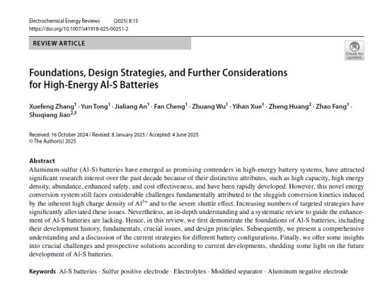 方钊教授课题组在高性能Al-S电池方面取得重要进展,相关工作以“Foundations,Design Strategies,and Further Considerations for High‑Energy Al‑S Batteries(高能量Al‑S电池基础、设计策略和进一步思考)”为题,发表在国际顶级期刊Electrochemical Energy Reviews(中科院分区:SCI一区Top;最新影响因子:36.3)上。魔性论坛