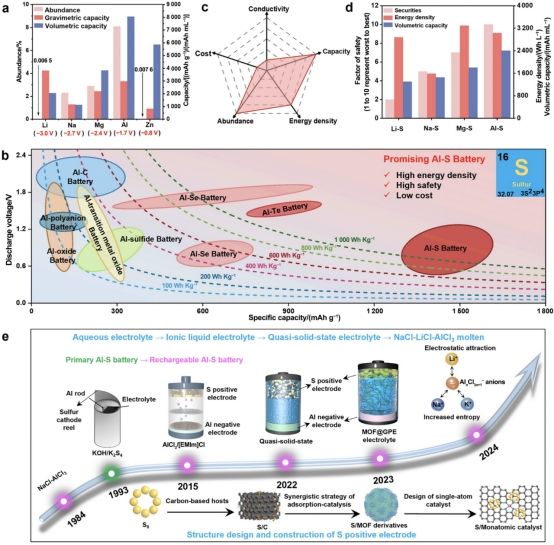 Al-S电池作为高能电池体系中极具潜力的竞争者,因其具有高容量、高能量密度、资源丰富、安全性高和成本低等特点,在过去十年中引起了广泛的研究兴趣,并得到了迅速的发展。然而,由于Al3+固有的高电荷密度导致的缓慢的转化动力学和严重的穿梭效应,这种新型的能量转换系统仍然面临相当大的挑战。目前缺乏深入的认识和系统的综述来指导Al-S电池性能的增强。因此,在本综述中,首先介绍了Al-S电池的基础,包括其发展历史、基本原理、关键问题和设计原则。