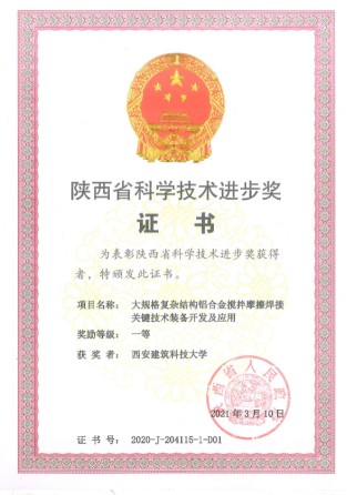 王快社教授团队完成的“大规格复杂结构铝合金搅拌摩擦焊接关键技术装备开发及应用”荣获陕西省科学技术进步奖一等奖。