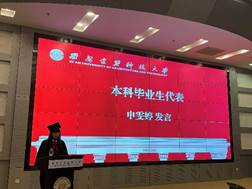 研究生毕业生代表韩鹏同学、本科毕业生代表申雯婷同学分别发表毕业感言。两位毕业生代表首先向学校、学院和老师们的精心培养表示了由衷的感谢,他们表示,作为新时代冶金学子,肩负着时代的重担,要树立新时代新征程新冶金的典范。要坚定信心,脚踏实地,在工作岗位中展现冶金雄风。要牢记母校“自强、笃实、求源、创新”校训,践行“为人诚实,基础扎实,作风朴实,工作踏实”校风,传承好建大精神,把青春奉献给祖国和人民。
