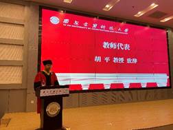 教师代表胡平教授以建大“为人诚实,基础扎实,作风朴实,工作踏实”的校风为同学们送上期许和嘱托,希望毕业生同学们牢记“四实”校风,在各行各业中发光发热,为祖国的建设添砖加瓦。希望全体毕业生把青春的种子撒向神州大地,初心不改,将自己的奋斗人生与民族和国家的命运紧密相连,做国家与民族的栋梁。