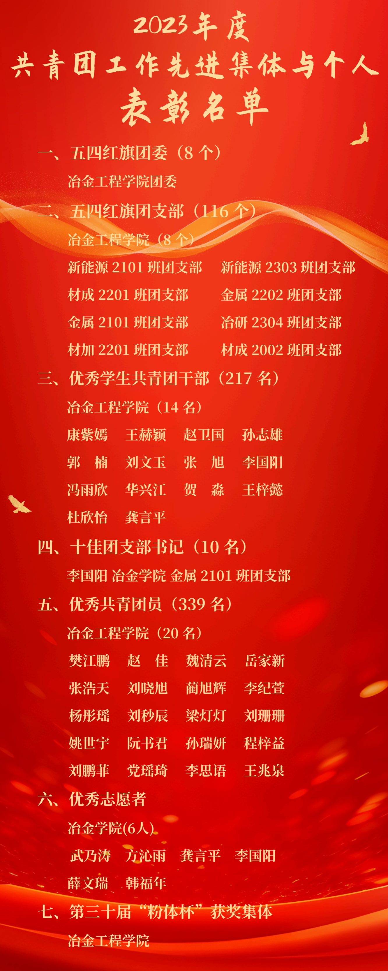 团学组织及个人以优异的成绩荣获“五四红旗团委”、“五四红旗团支部”、“优秀共青团干部”、“优秀共青团员”多项荣誉。