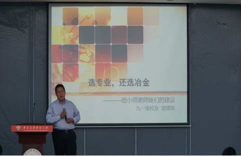 91级杰出校友曾建新学长向大家做励志成才报告。他结合自身多年国际市场打拼的经验,以开阔的视野和格局分析讲解了冶金工程未来发展道路上的前景,希望同学们能坚守自己所爱,学到一身理工科专业的硬功夫。学长用诙谐幽默的语言,传达给大家许多值得深刻思考的道理,赢得现场观众的热烈掌声。