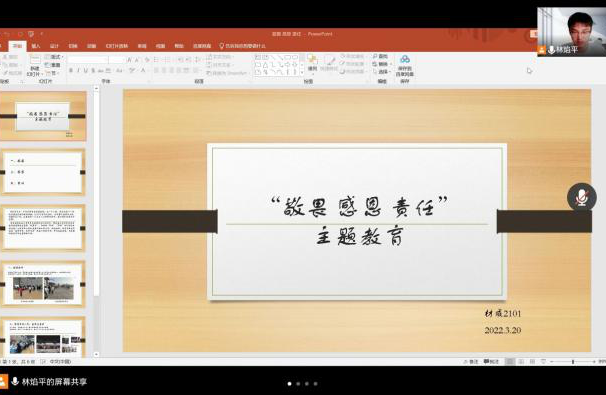 为进一步提升学生的综合素质,培养学生的社会主义核心价值观,引导学生树立敬畏、感恩、责任意识。材成2101班于3月20日在线上召开“敬畏、感恩、责任”主题班会。班会由班长林焰平主持,班主任蔡军及全体同学参加此次班会。