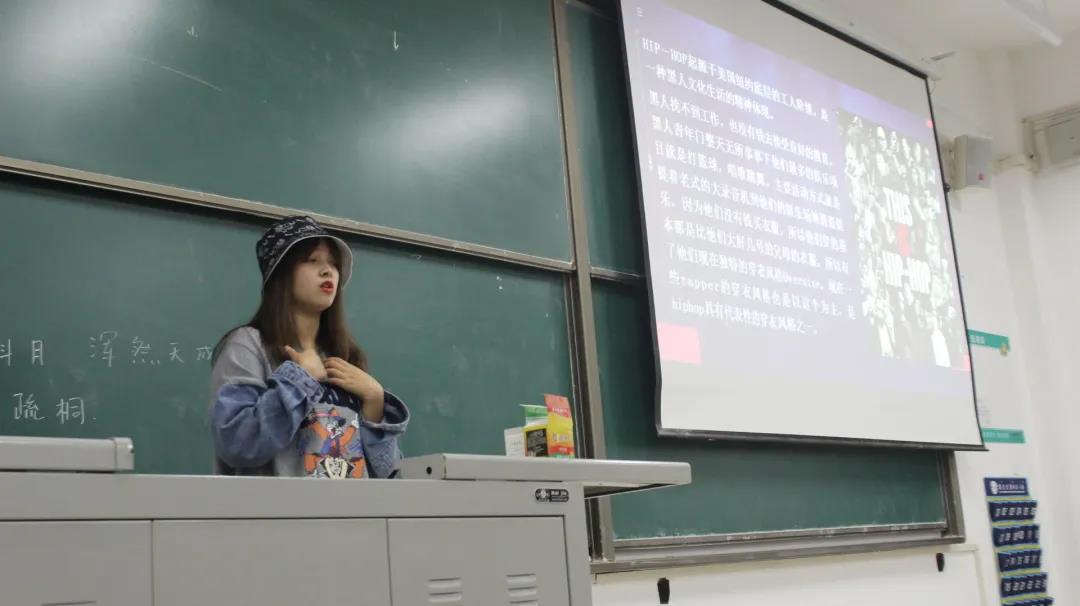 随后,谢雨杉同学向大家着重介绍说唱,同时告诉同学们随着时代的变化,说唱文化不但没有被淘汰,反而被更多的人认可。接下来,谢雨杉同学列举出与hip-hop说唱有关的例子,并从hip-hop说唱的团体,赛事节目以及音乐厂牌三个方面继续向大家详细介绍,使同学们对hiphop说唱有了更深入的了解,激发了同学们对hip-hop文化的热情。最后谢雨杉同学播放了hip-hop说唱的相关视频,并向同学们传达出“每一种文化都值得尊敬”的理念。