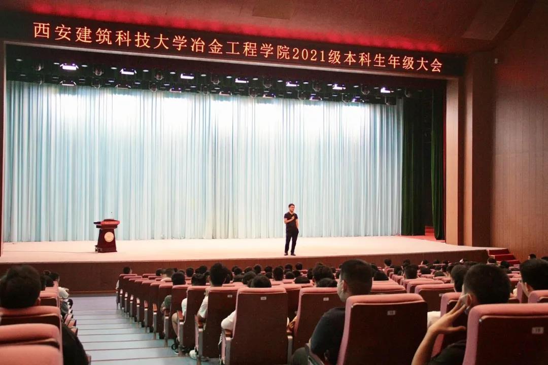 在紫阁大礼堂召开2021级本科生年级大会。本次大会由2021级本科生辅导员乔柯和陈善勇主持并召开。