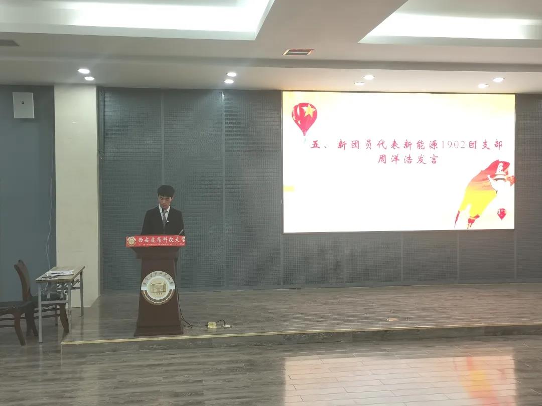 仪式第五项,新团员代表新能源1902团支部周洋浩同学进行发言。不忘初心、牢记使命,时刻以团员的标准严格要求自己,勤奋学习,锐意进取,不骄不躁,努力为团旗增色,为团徽增光,为共产主义事业奋斗终身!