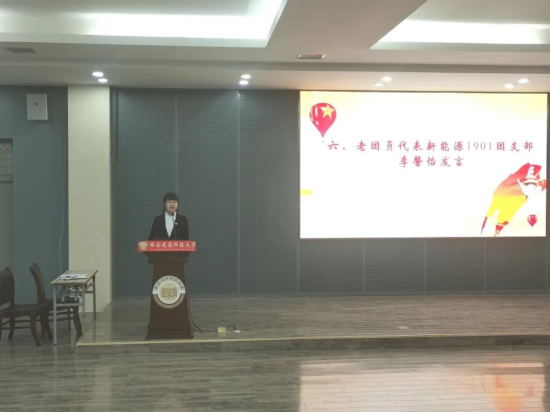 仪式第六项,老团员代表新能源1901团支部李馨怡同学进行发言。她衷心祝贺九名同学成为光荣的共青团员,也希望从现在开始他们要在各个方面树立榜样,严格要求自己,认真履行团员义务,不负共青团员的光荣称号。