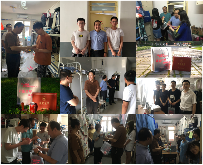 7月8日下午,学院党委书记马立建,院长李林波,党委副书记、副院长张佩,副院长李小明、杨西荣,学生工作办公室主任赵福才,学院团委书记康彦,毕业班辅导员张洋子、罗帅和其他年级辅导员乔柯、董甜子,前往学生宿舍看望慰问即将离校的每一位2020届毕业生同学,并送去学院精心准备的毕业纪念礼包。学院领导和老师细心询问了同学们的近期行程计划和就业去向,鼓励同学们在新的环境要有激情、有担当、有活力,要以满腔热血积极投身强国之战,同时希望同学们能不忘师恩,常回母校看看。