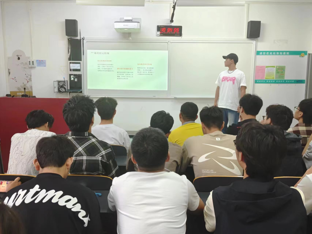各班班长在班会上就学风及遵规守纪进行了简要阐释。学风,是校园文化的灵魂,是学生成长的摇篮;而遵规守纪,则是学风建设的基石。在校园中,我们每一个学子都应以遵规守纪为准则,共同营造一个积极向上的学风环境。