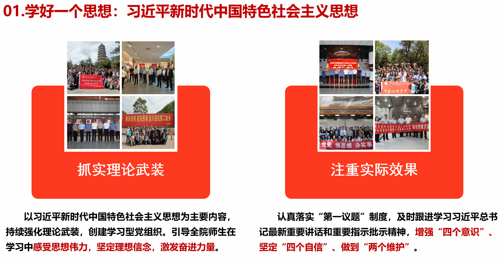 学院党委连续被评为“先进党委”,首批入选学校“党建工作示范学院”,获批“全省党建工作标杆院系”,成为全校第一个党建、团建省级“双标杆”创建学院,学院团委获“全国钢铁行业五四红旗团委(标兵)”。1个党支部入选“全国党建工作样板支部”,2个党支部入选“全省党建工作样板支部”,4个党支部入选校“党建工作样板支部”,获批“双带头人”教师党支部书记工作室2个。一流专业、一流课程、国家级人才、国家自然科学基金重点项目、国家重大科研仪器研制项目、国家重点研发计划项目都实现新突破。连续荣获“年度考核优秀学院”,荣获“陕西省师德建设先进集体”荣誉称号。